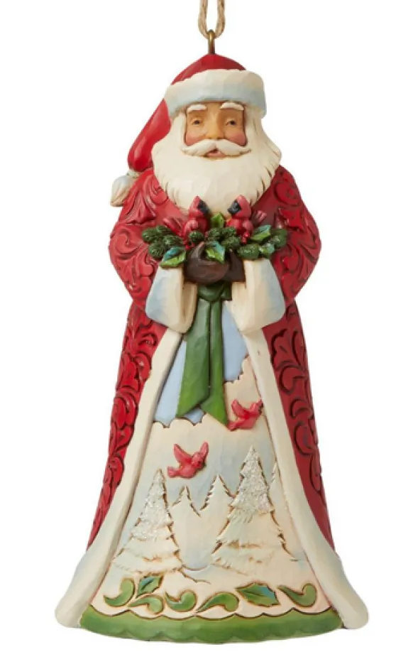 Wearing A Red And Green Patterned Cloak, Santa Smiles Jollily In This Brightly Hued Ornament. Holding A Bushel Of Holly, Two Cardinals Perch Under Santa’s Watchful Eye. With Classic Jim Shore Rosemaling Pattern, Holiday Spirit Is Magnified.