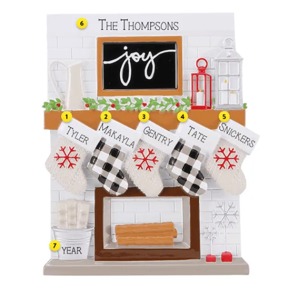 Commemorate Your Holiday Season With This Adorable Ornament. This Updated Modern Farmhouse Design Will Be The Perfect Addition To Your Tree This Year! Five Stockings Hung By The Fireplace Represent Your Family. Have It Personalized For Free To Make It Extra Special.