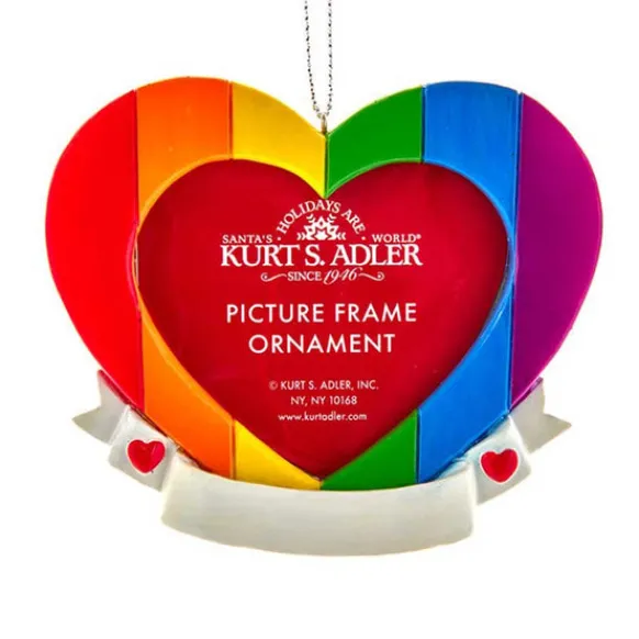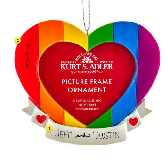 Kurt Adler’s Heart Shaped Pride Picture Frame Ornament Is A Great Addition To Any Holiday Decor Or Christmas Tree. This Ornament Features A Heart Shaped Picture Frame In Pride Colors With A White Banner That Can Be Personalized.