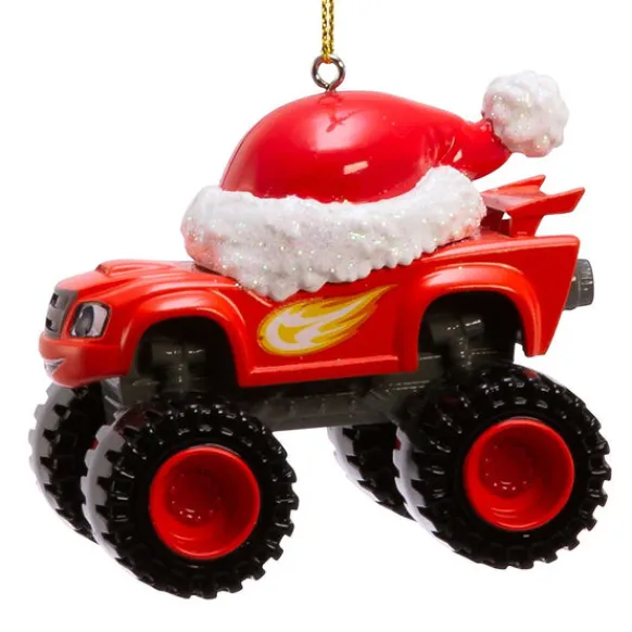 This Blaze™ Monster Truck Ornament Is A Fun And Adventurous Addition To Your Christmas Tree. The Ornament Features A Red-Orange Monster Truck With A Red Glistening Santa Hat On Top. The Wheels Of The Truck Are Black And Red And The Doors Feature A Design Of An Orange And White Flame.