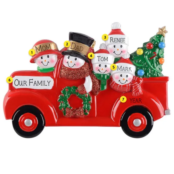 This Ornament Features A Snowman Snowman Family Of 5 In A Red Truck With A Christmas Tree In The Back. Remember Your Christmas Festivities With Your Family By Personalizing Your Ornament For Free.