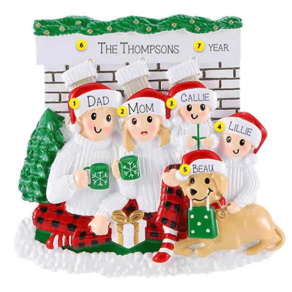 Capture The Cheer Of Your Household With This Festive Personalized Fireplace Family Of 4 With Dog Ornament! This Charming Design Features A Family Of Four Gathered Around The Fireplace, Along With Your Beloved Pet, To Create A Beautiful Holiday Finishing Touch.