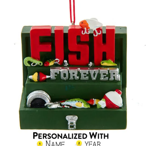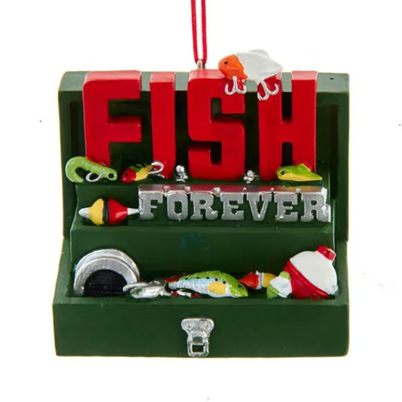Kurt Adler’s “Fish Forever” Tackle Box Ornament Is A Festive Addition To Any Holiday Decor Or Christmas Tree. It Features A Green Tackle Box Filled With Fishing Gear And Is Hung By A Red String.