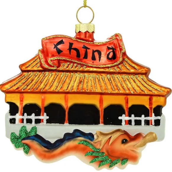 A Dragon Symbolizing Power, Strength, And Good Luck Presides Over An Ancient Pagoda In This Artful Tribute To Chinese Culture. Featuring A Red Banner With The Word China, This Vibrant 3½” Tall X 4½” Tall Ornament Is Skillfully Crafted Of Glass With A Myriad Of Vivid Glazes And Dazzling Glitter Accents. A Ying Yang Symbol In Vivid Black And White Is Depicted On The Reverse Side Of Ornament. Coming Ready To Hang With A Gold Cord, This Exquisitely Detailed Ornament Makes A Charming Memento For Those Who Have Visited, Or Plan To Visit, The East Asian Country Of China!