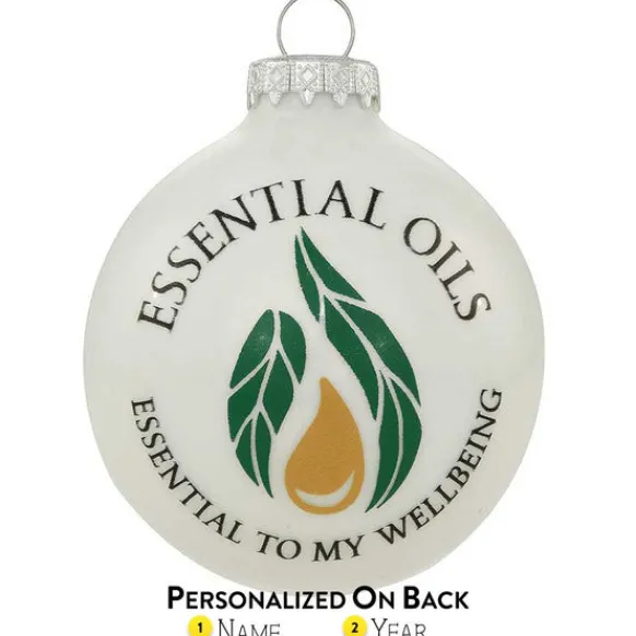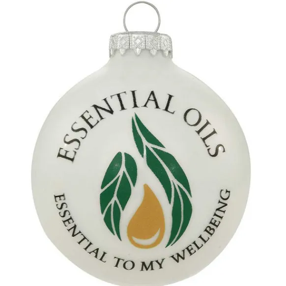 This Glass 3″ Round White Enameled Ornament Features A Green Leaf And Oil Drop Design Along With The Sentiment: “Essential Oils, Essential To My Wellbeing”.