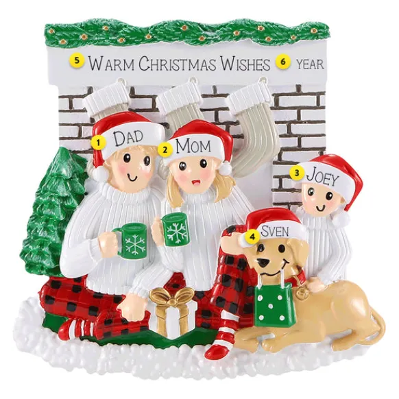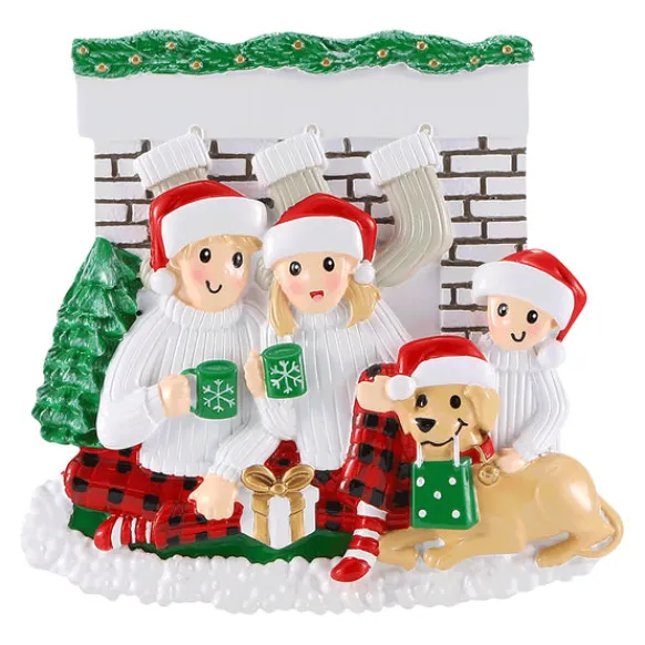 Let Your Fireplace Come Alive On Your Tree With This Festive Personalized Fireplace Family Of 3 With Dog Ornament! Featuring An Adorable Family Gathered Around The Fireplace, With Your Furry Companion Included, It’s The Perfect Way To Show Your Holiday Spirit!